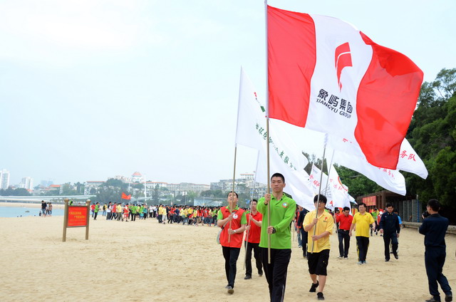 活動啟動儀式上,集團公司黨委副書記、工會主席陳偉彬代表集團領(lǐng)導(dǎo)班子向共建單位代表及全體員工致以節(jié)日的問候!陳副書記表示,我們要尊重勞動、謳歌勞動者;我們要倡導(dǎo)運動,褒獎優(yōu)勝者;我們崇尚遠(yuǎn)大的理想,憧憬美好的未來。海軍南方局李躍峰副政委對象嶼集團在勇?lián)鐣?zé)任、傳承愛心善行方面所作的努力高度贊揚,并表示這對深入培育當(dāng)代革命軍人核心價值觀方面具有十分積極的推動促進(jìn)作用。隨后進(jìn)行了“象嶼集團縱走俱樂部”授旗儀式,集團總裁張水利為縱走俱樂部授旗,號召更多縱走愛好者“走在一起,樂在一起”!集團及海軍南方局領(lǐng)導(dǎo)、十佳員工及志愿者代表鳴槍發(fā)令,全體人員在司旗的帶領(lǐng)下,向著音樂廣場出發(fā)了!