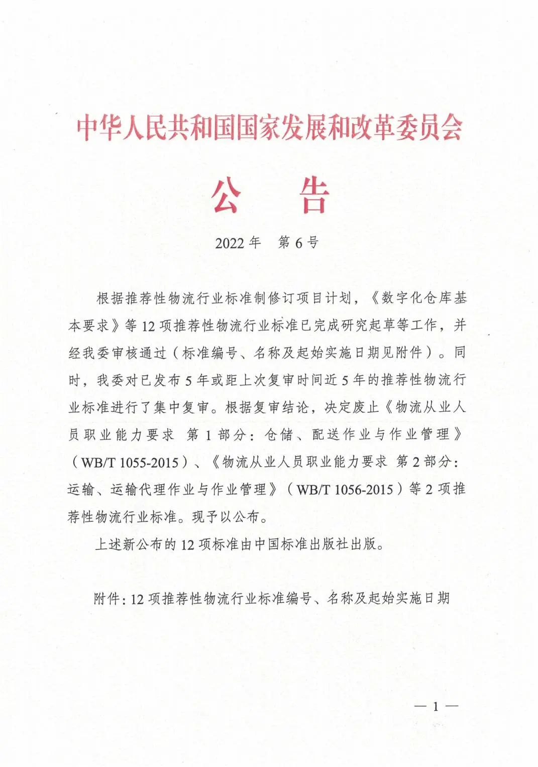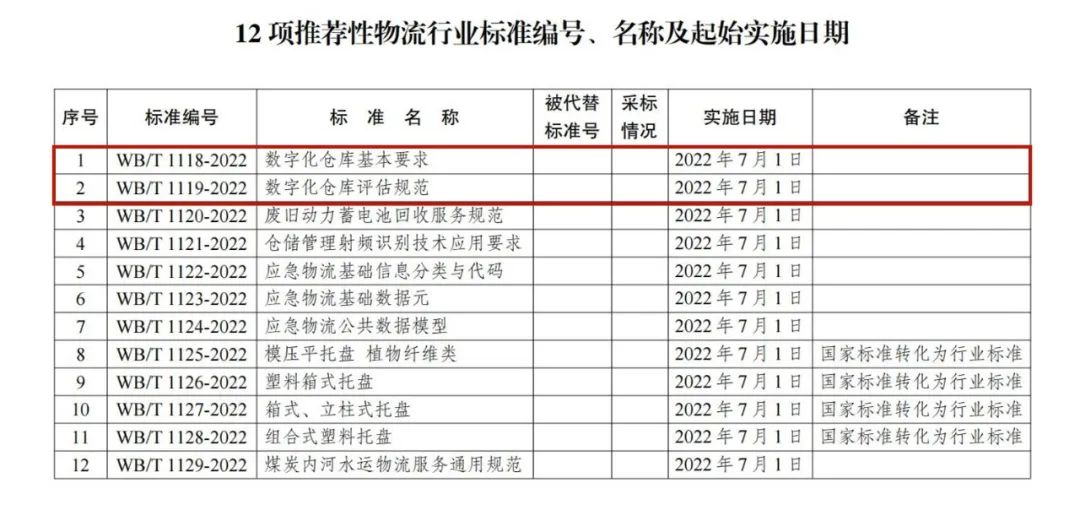 近日,中華人民共和國國家發(fā)展和改革委員會印發(fā)了2022年第6號公告,批準發(fā)布12項推薦性物流行業(yè)標準。其中,由廈門象嶼股份有限公司參與編寫的《數(shù)字化倉庫基本要求》(WB/T 1118-2022)《數(shù)字化倉庫評估規(guī)范》(WB/T 1119-2022)2項推薦性物流行業(yè)標準于2022年7月1日正式實施。