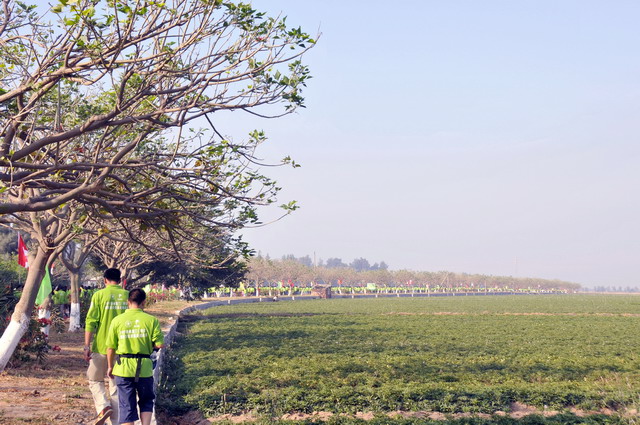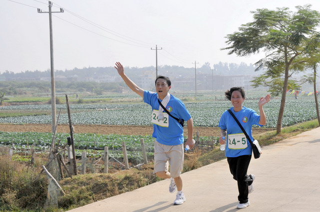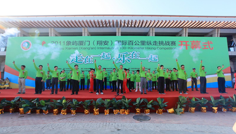 11月5日8時(shí)09分,明媚秋光里,廈門市委常委、副市長臧杰斌宣布2011象嶼廈門(翔安)國際百公里縱走挑戰(zhàn)賽開始,廈門市人大常委會(huì)副主任黃杰成、廈門市政協(xié)副主席陳昌生、國家奧林匹克體育中心副主任彭維勇、象嶼集團(tuán)總裁張水利等一起為比賽鳴槍。來自28個(gè)國家和地區(qū)的近萬名運(yùn)動(dòng)愛好者,從大嶝小鎮(zhèn)·臺(tái)灣免稅公園廣場(chǎng)出發(fā),穿越田野、海濱、山巒、閩南古厝,開始了一段挑戰(zhàn)自我的征途。這其中,由象嶼集團(tuán)員工及家屬、合作伙伴、共建單位等組成的千人象嶼團(tuán)隊(duì)分外引人注目,浩浩蕩蕩的象嶼人走在一起、樂在一起,在欣賞沿途自然、人文風(fēng)光的同時(shí),也享受著挑戰(zhàn)自我、永不止步的健康向上,享受著與同事、親朋共度美好秋假的怡然歡樂。