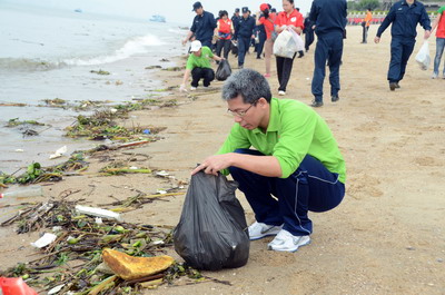 員工和官兵代表們配合默契撿拾木棧道沿途垃圾