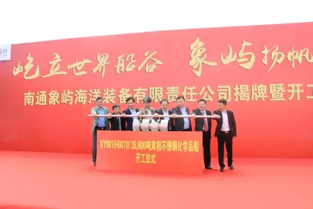 首制船“XY001”號38800噸不銹鋼化學(xué)品船同期開工。江蘇省經(jīng)信委副主任、國防科工委主任秦雁,南通市委常委、通州區(qū)委書記宋樂偉,南通市副市長徐新民,通州區(qū)區(qū)委副書記、區(qū)長陳永紅,華融航運(yùn)金融租賃有限公司總經(jīng)理樊旭平,象嶼集團(tuán)總裁陳方,中海重工董事局主席李明,南通象嶼副董事長朱建華,共同推動(dòng)38800噸不銹鋼化學(xué)品船開工桿!