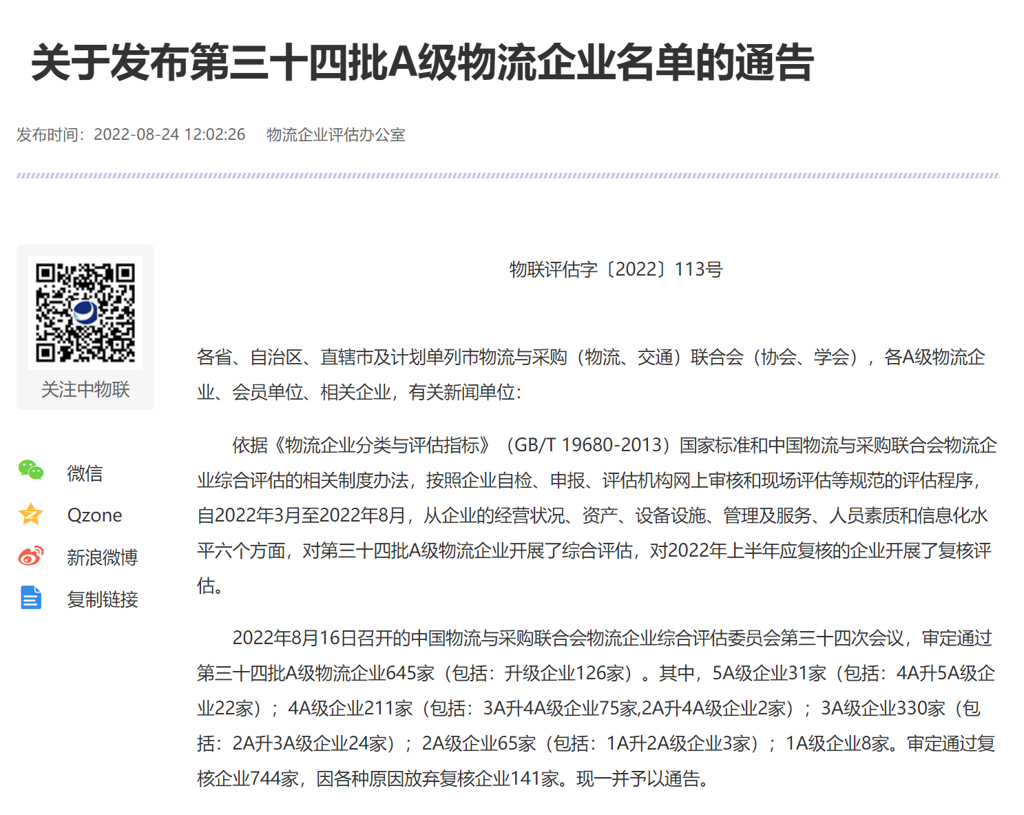 今天,中國物流與采購聯(lián)合會(huì)發(fā)布“全國第三十四批A級物流企業(yè)名單”,象嶼股份旗下企業(yè)象道物流集團(tuán)有限公司(以下簡稱:象道物流)以大宗商品物流可持續(xù)發(fā)展創(chuàng)新模式與實(shí)踐成果,榮膺最高評級國家5A級綜合服務(wù)型物流企業(yè),成為象嶼股份體系第三家獲此殊榮的企業(yè)。