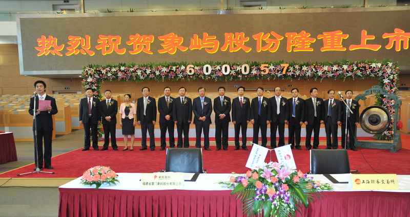 2011年8月29日,福建省廈門象嶼股份有限公司在上海證券交易所舉行隆重的重組上市儀式。廈門市人民政府葉重耕副市長及象嶼股份王龍雛董事長共同敲鑼開盤。象嶼股份股價高開逾1倍,開盤價8.25元,早市最高漲127.5%。截至早市收盤,報8.29元,漲108.29%。